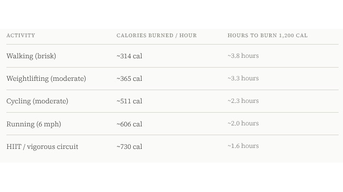 Here's what burning a meaningful portion of that looks like in real exercise time, for a person weighing around 160 pounds at moderate to vigorous intensity: